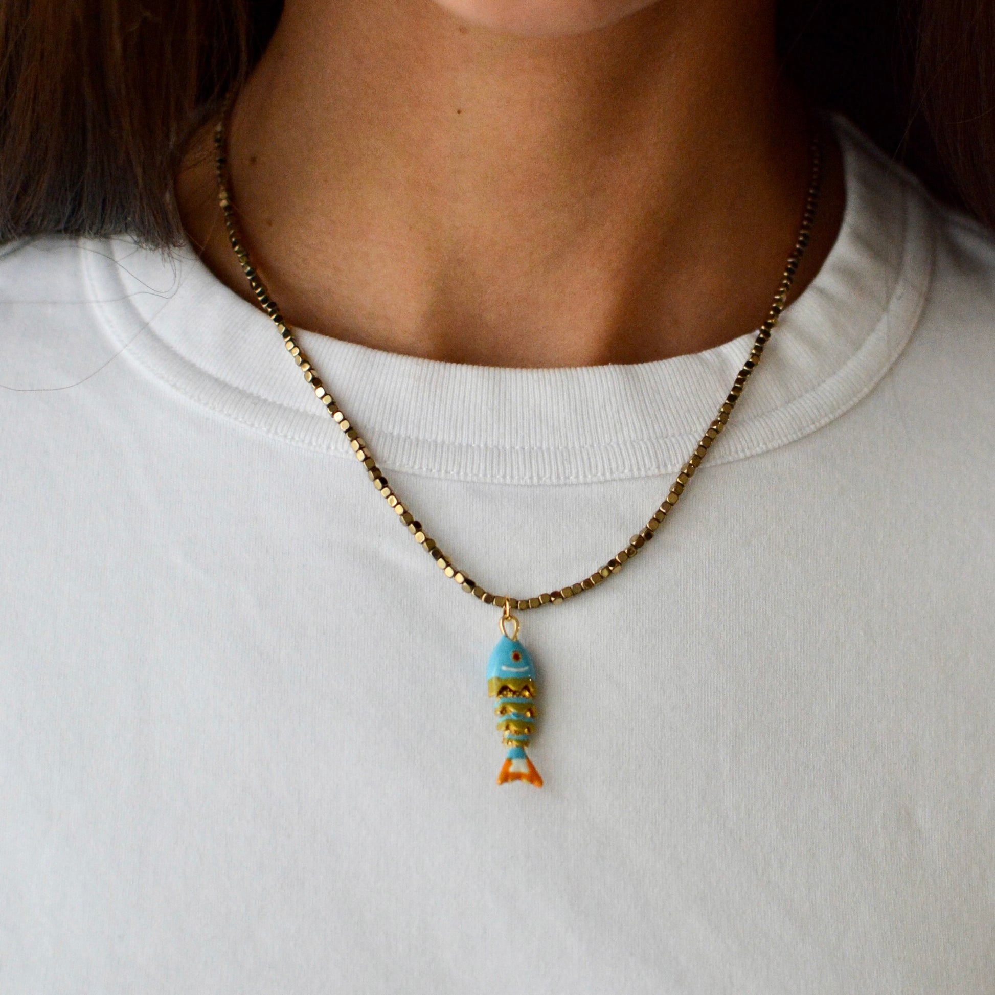 Notre collier AMALFI allie élégance et audace. Ce bijou est conçu à partir de perles de pyrite dorées, soigneusement choisies pour leur éclat et d'un charm poisson articulé bleu. Collier à porter seul ou en accumulation.