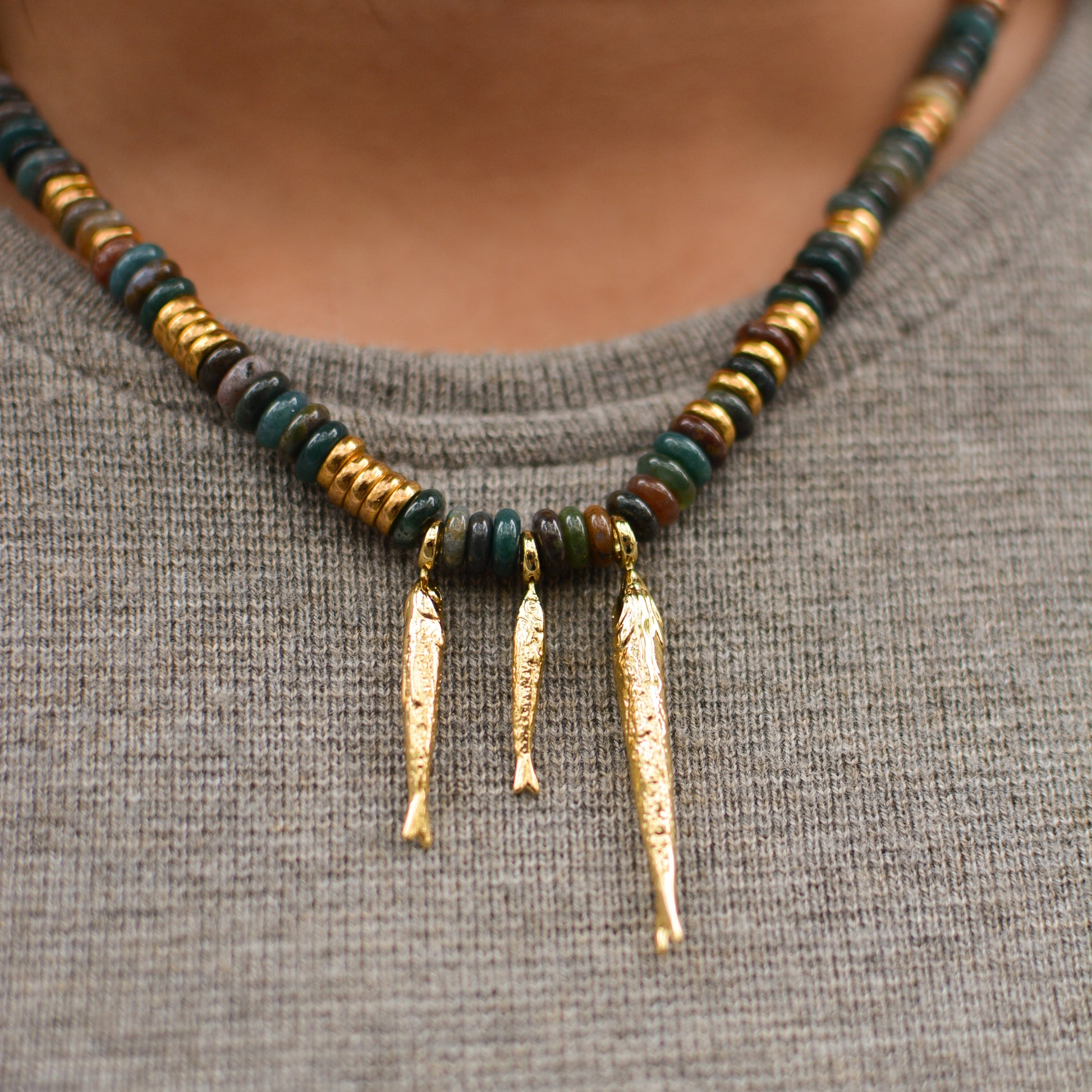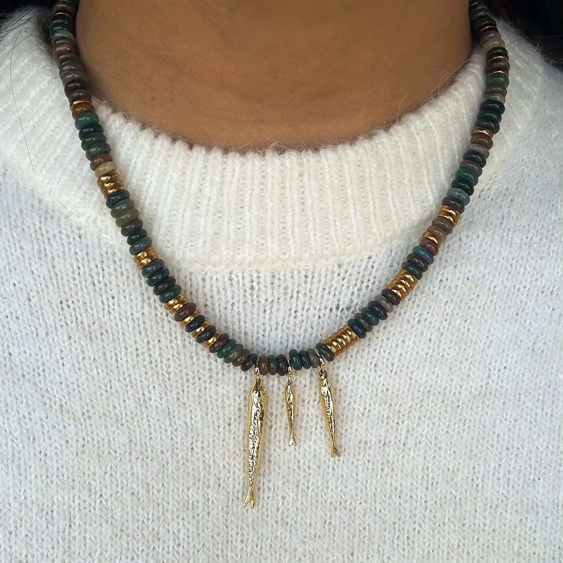 Notre collier Bora Bora est une création originale Rose Hill. Ce bijou composé de pierres d’agate semi précieuses et de charms poissons est fabriqué à la main dans nos ateliers parisiens.
