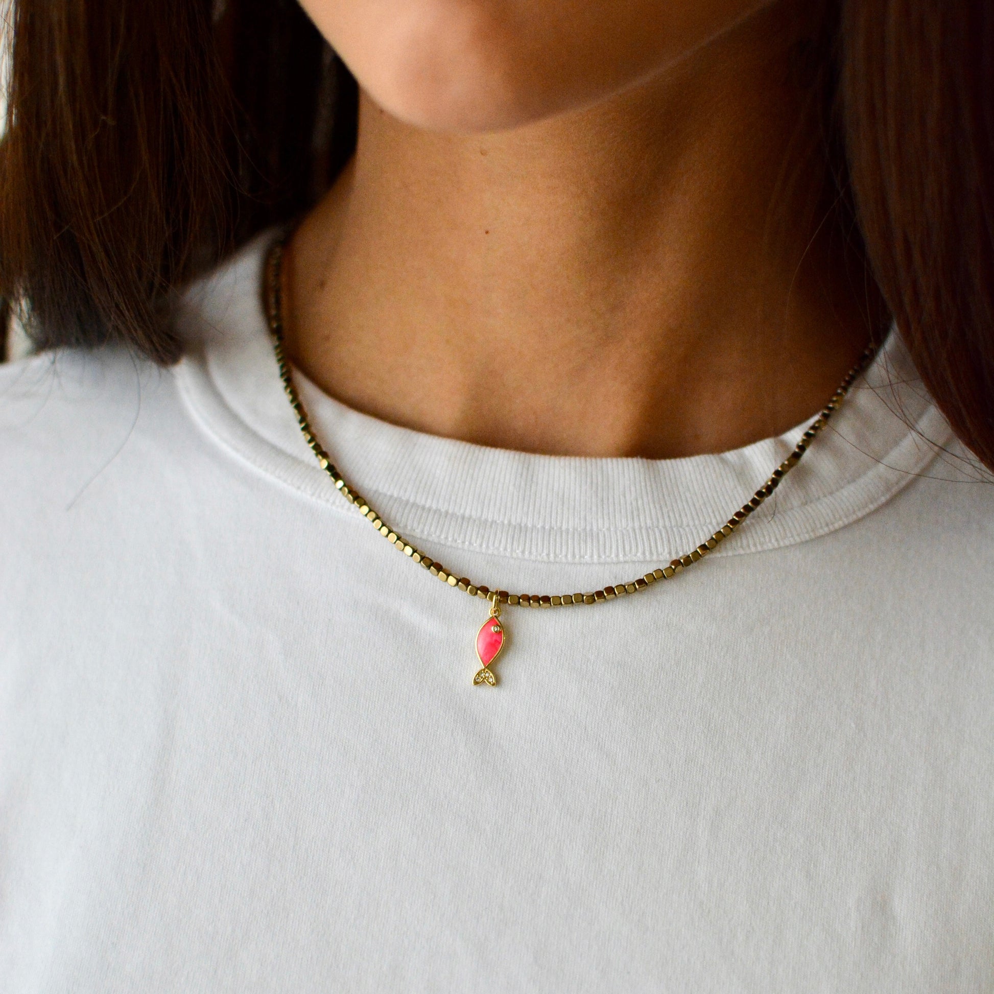 Notre collier COPACABANA est une création originale Rose Hill paris qui allie l'élégance à la nature. Entièrement fabriqué à la main dans notre atelier parisien, ce bijou se compose de perles de pyrite dorées et d'un charm poisson rose.