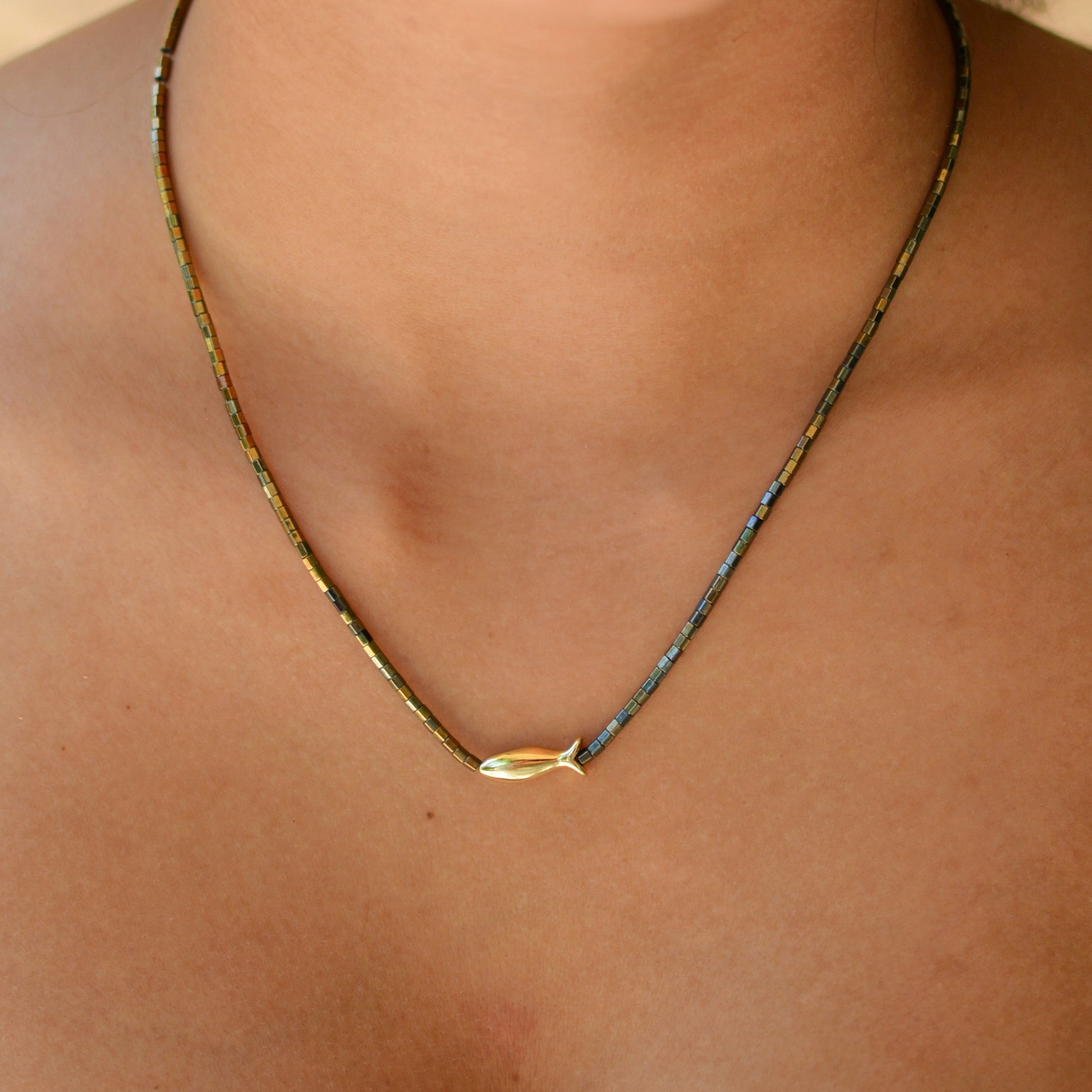 Le collier Saint-Raphël est fait à la main et composé de pierres d’hématite semi précieuses plaquées or.